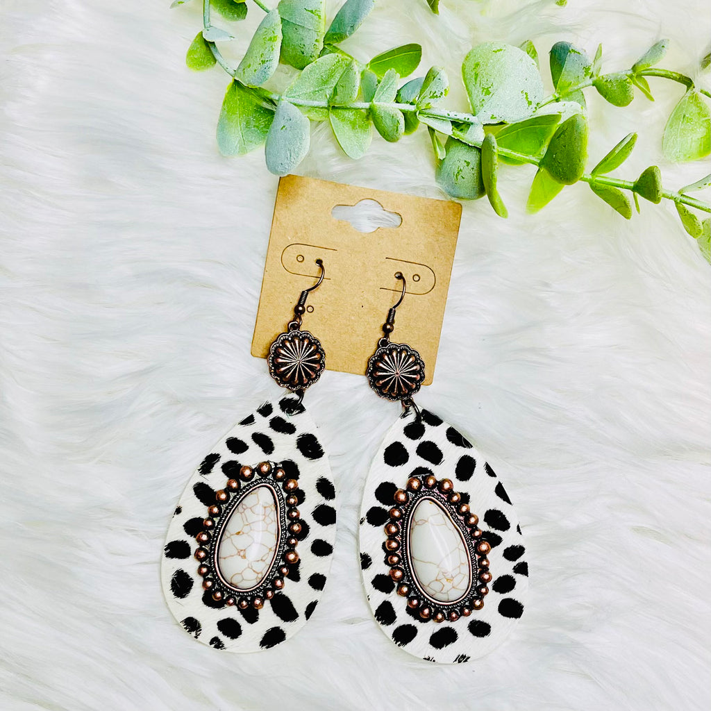 White Leopard White Stone Teardrop Bronze Earrings