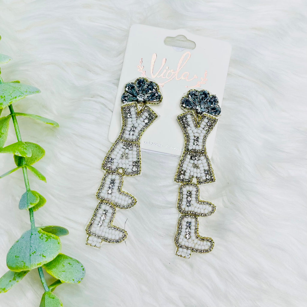 YELLOW GLITTER ON BLUE SAGE CREAM YELLOW FLORAL PRINT SCALLOPED LEATHER TWO TIER DANGLY HANDMADE EARRINGS BY B.O.D