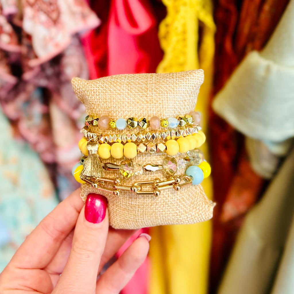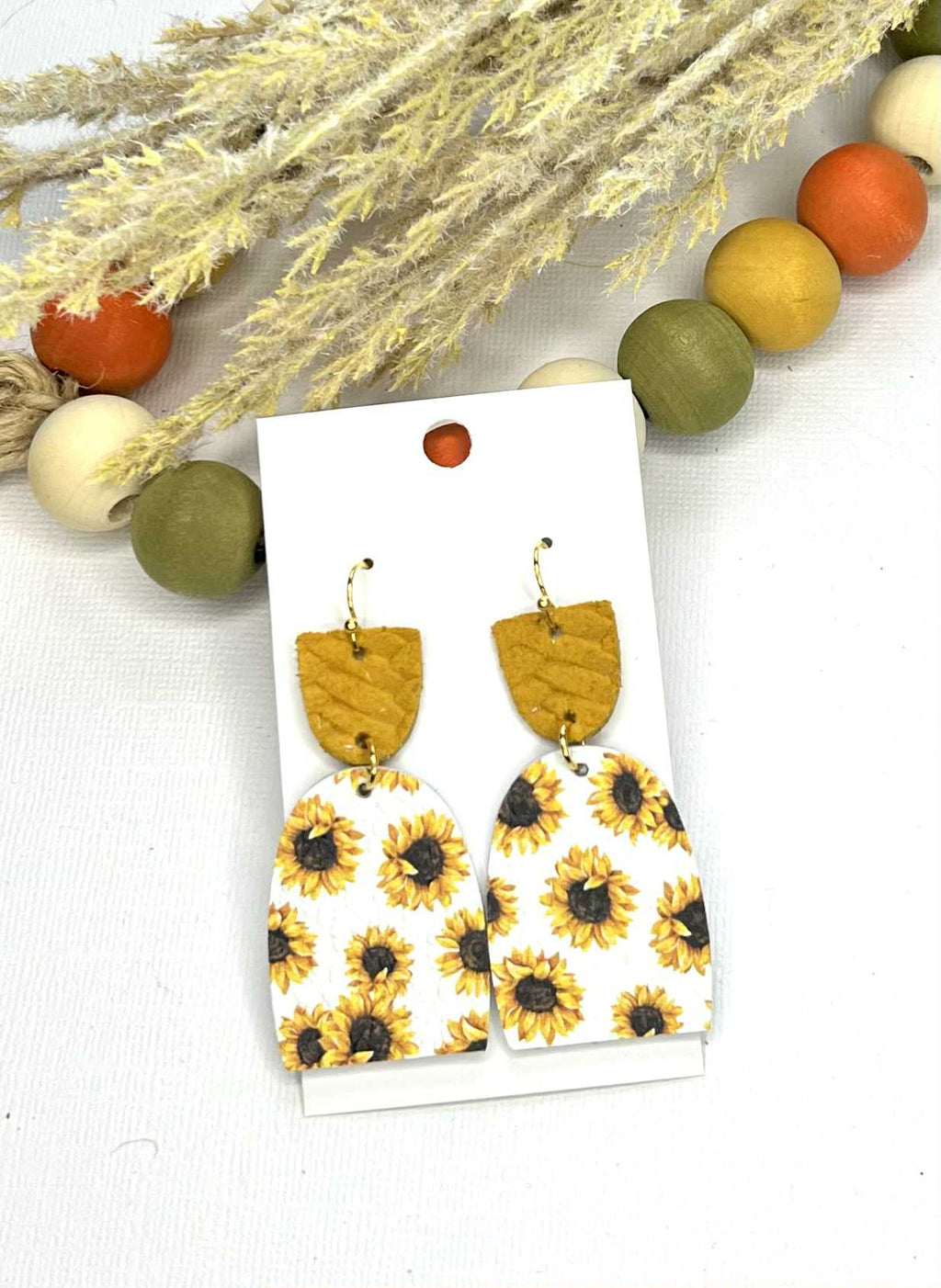 YELLOW SUNFLOWER LEATHER TEXTURED-BASKET-WEAVE 2-TIER DANGLY GEO SHAPED HANDMADE EARRINGS BY B.O.D
