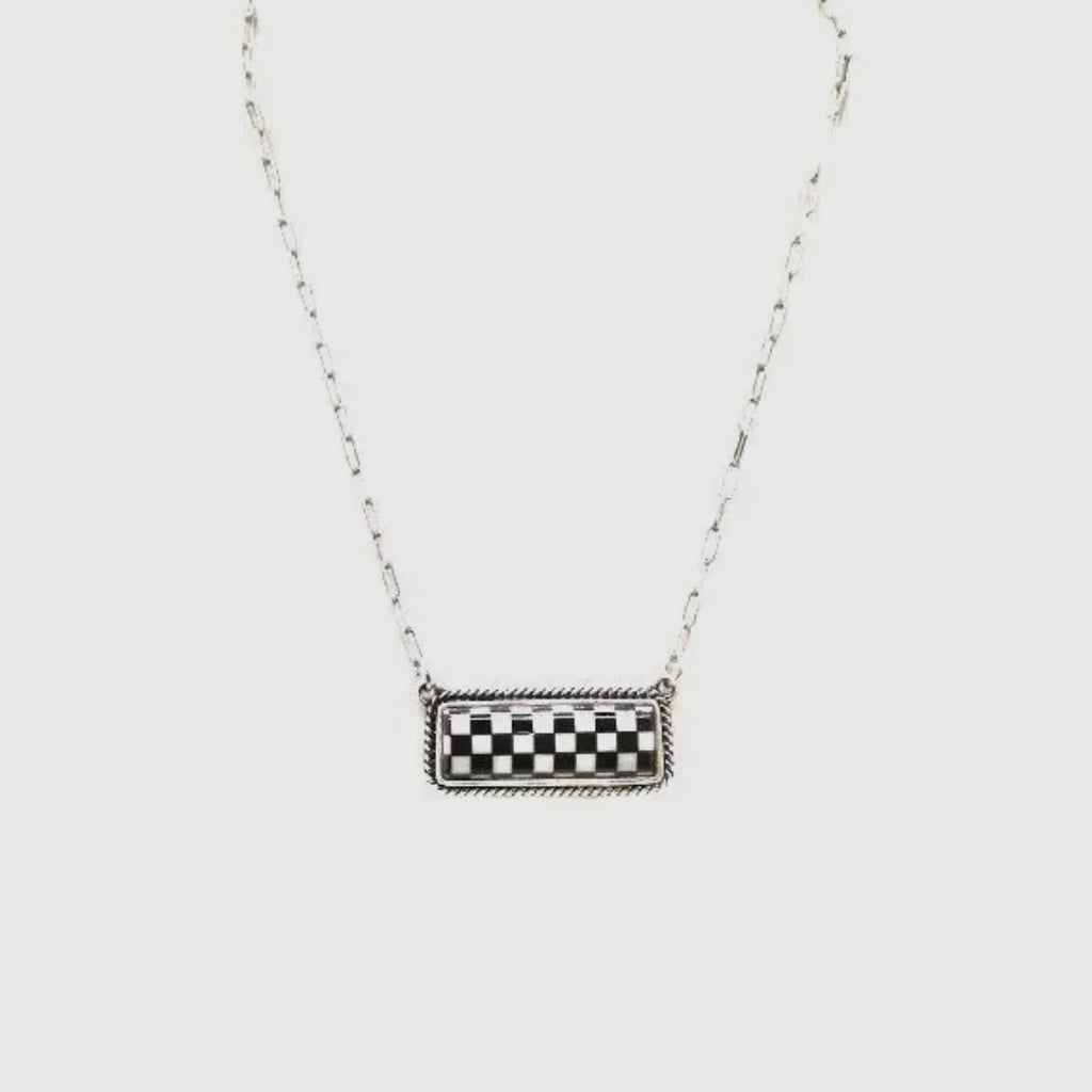 BLACK & WHITE CHECKERED PRINT RECTANGLE HORIZONTAL BAR NECKLACE