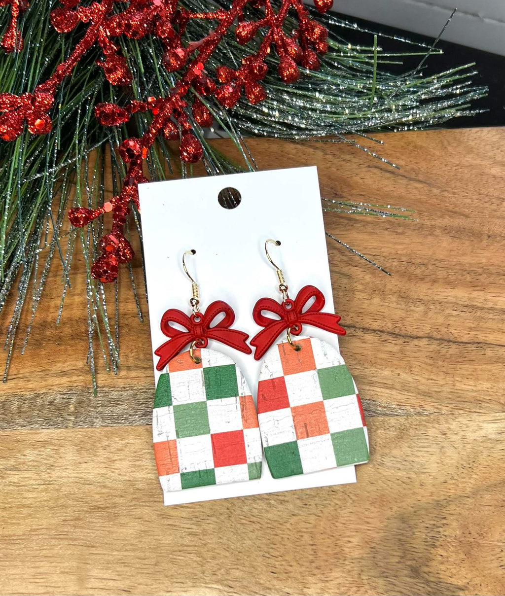 RED GREEN CHECKERED PRINT WITH RED METAL BOWS FOR CHRISTMAS HANDMADE EARRINGS BY B.O.D