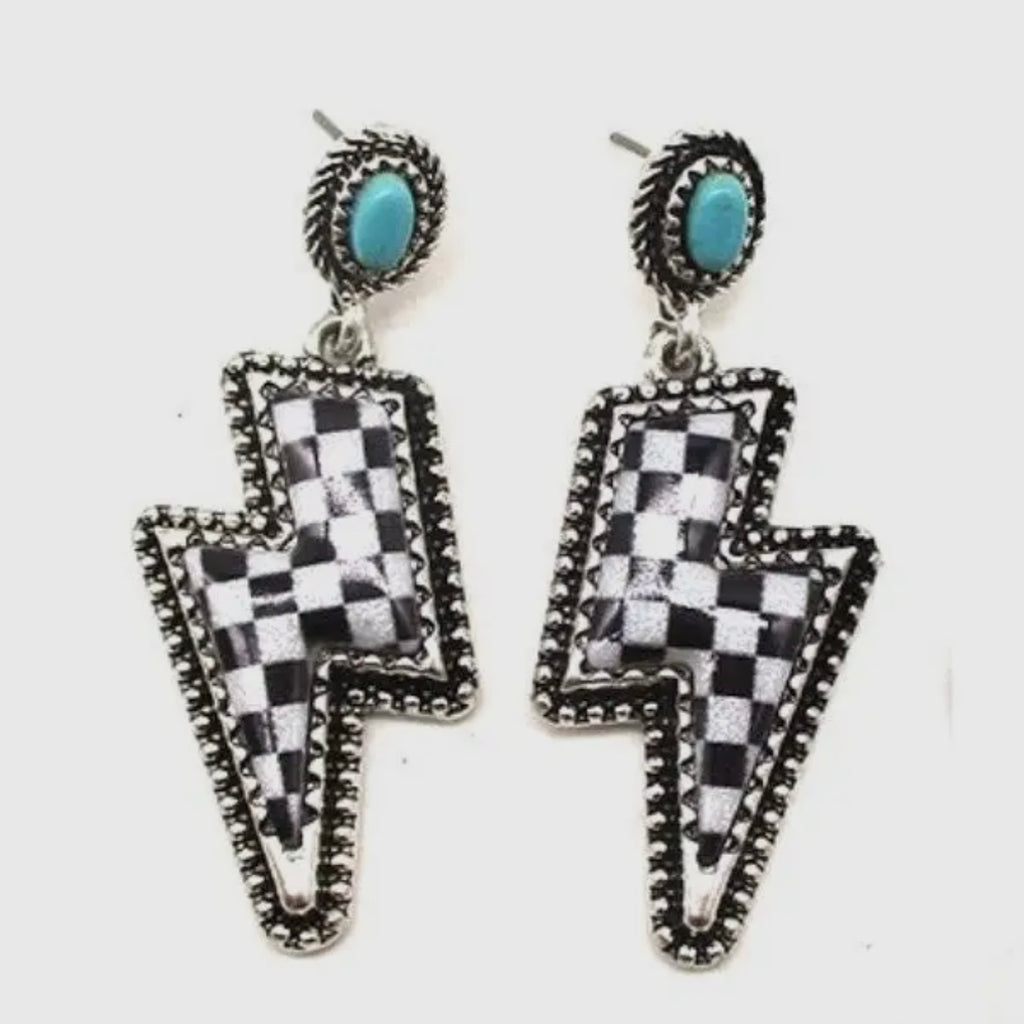 CHECKERED PRINT LIGHTENING BOLT DANGLE TURQUOISE STONE EARRINGS