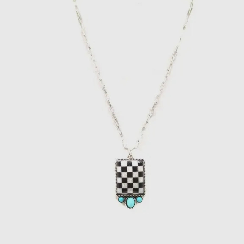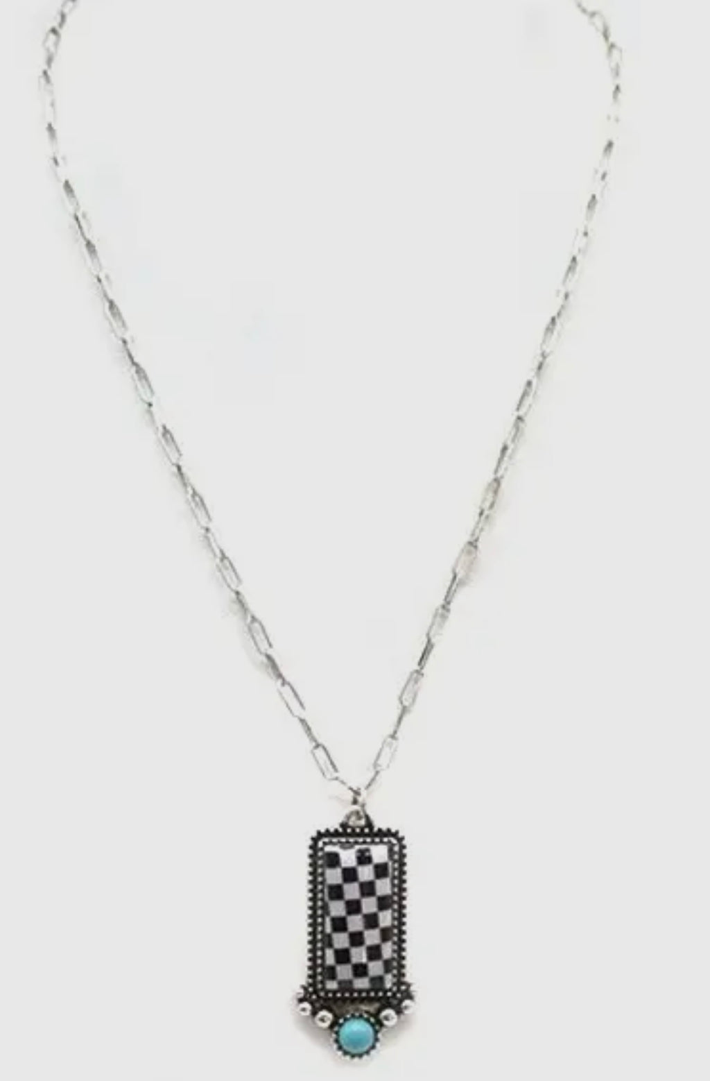CHECKERED FLAG PRINT & SHAPE TURQUOISE STONE NECKLACE