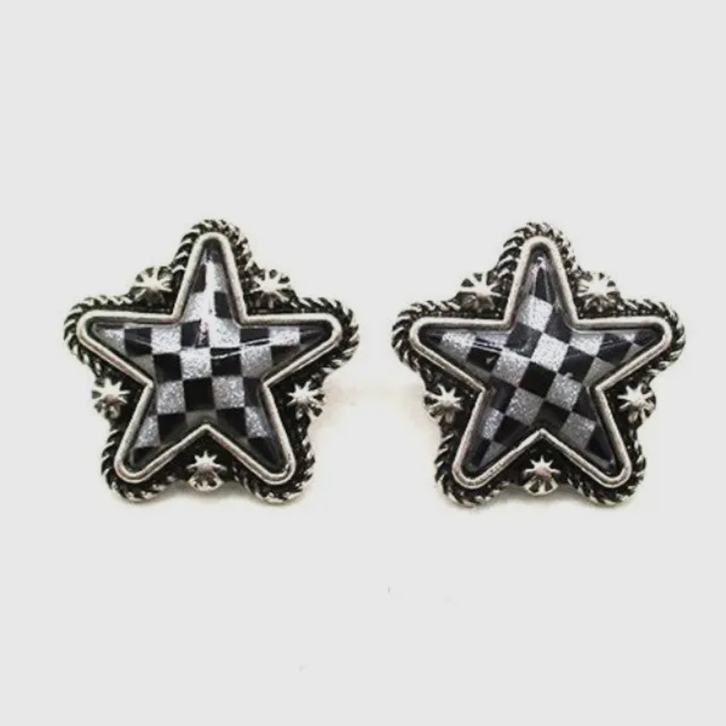 BLACK & WHITE CHECKERED PRINT STAR SHAPE EARRINGS