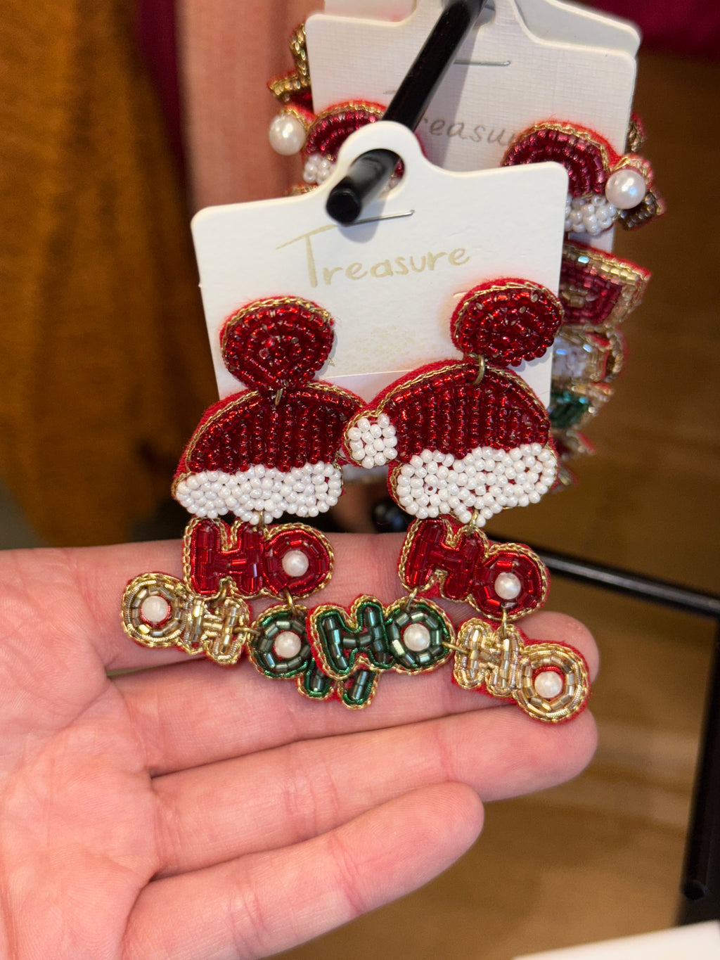 HO HO HO SEEDBEAD SANTA HAT CHRISTMAS EARRINGS