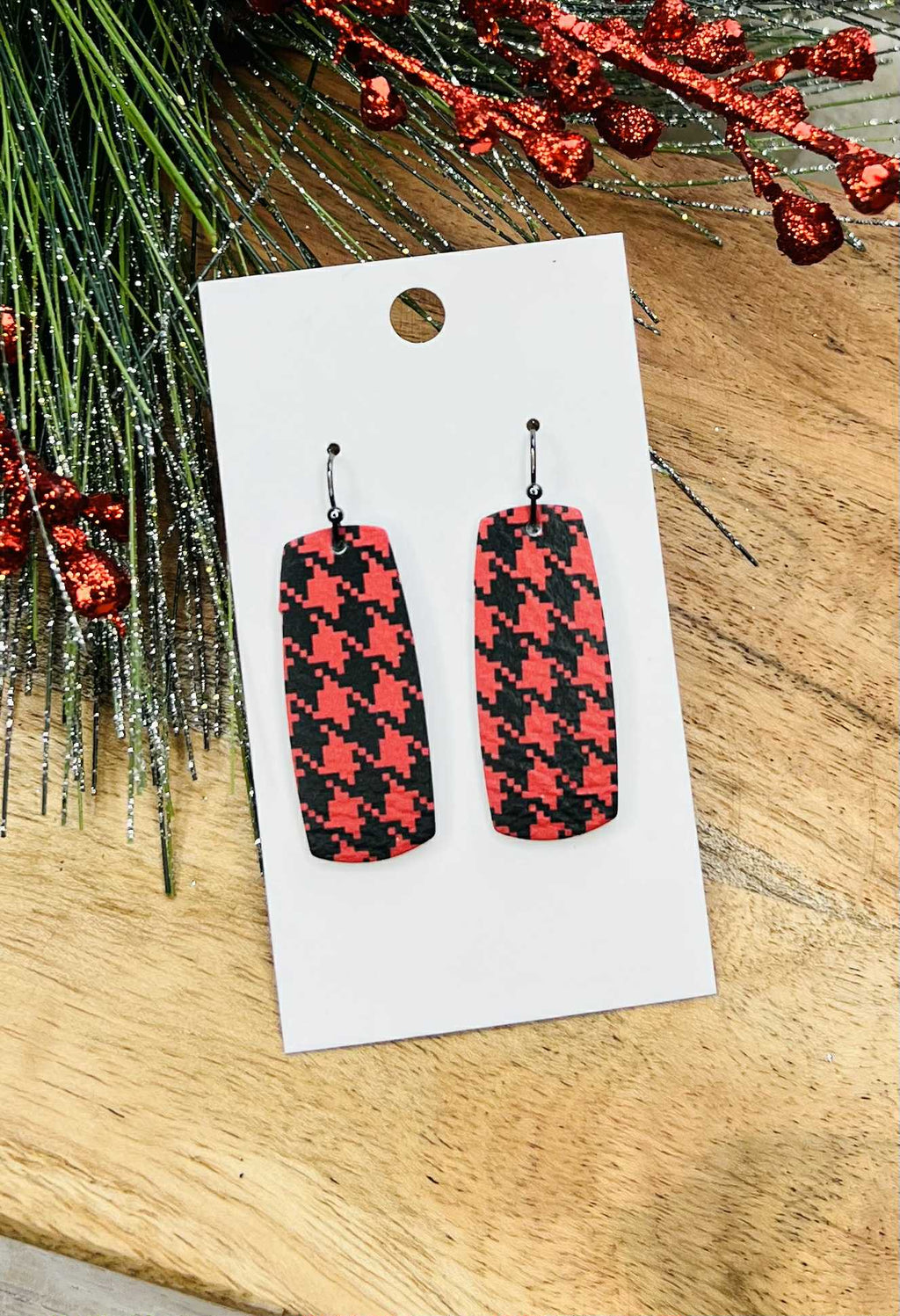 LEATHER RECTANGLE RED BLACK HOUNDSTOOTH DESIGN HANDMADE EARRINGS BY B.O.D