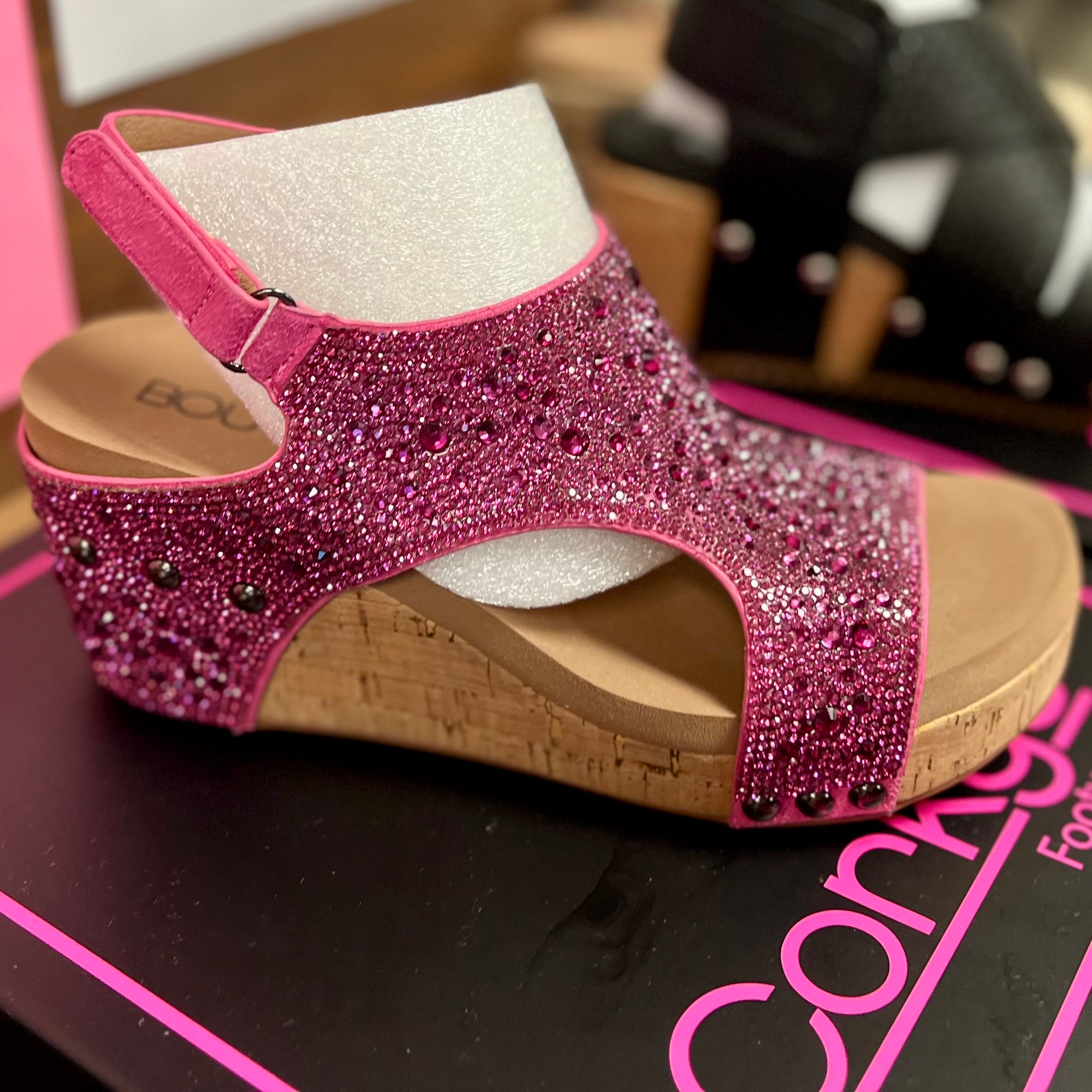 THE ASHLEY FUCHSIA RHINESTONE CORKYS WEDGES- SALE- SIZES 6 & 7 LEFT
