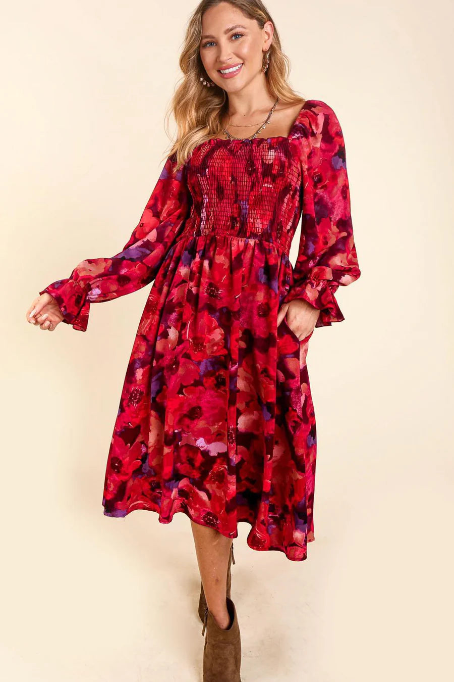 RED BLACK SMOCKED FIT & FLARE POCKETED FLOWY CHIFFON MIDI/MAXI DRESS-PLUS