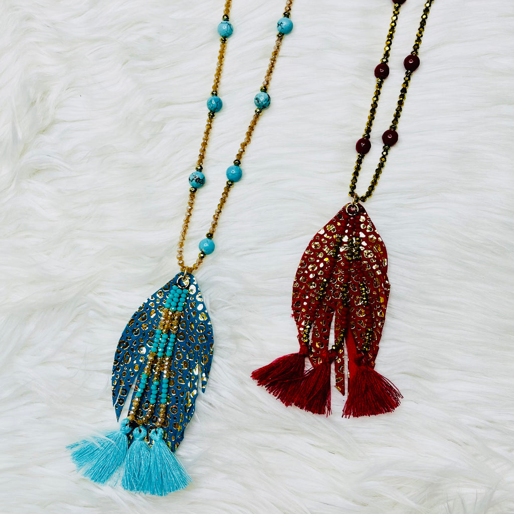Crystal Beaded Feather Crystal Beaded Tassel Necklace