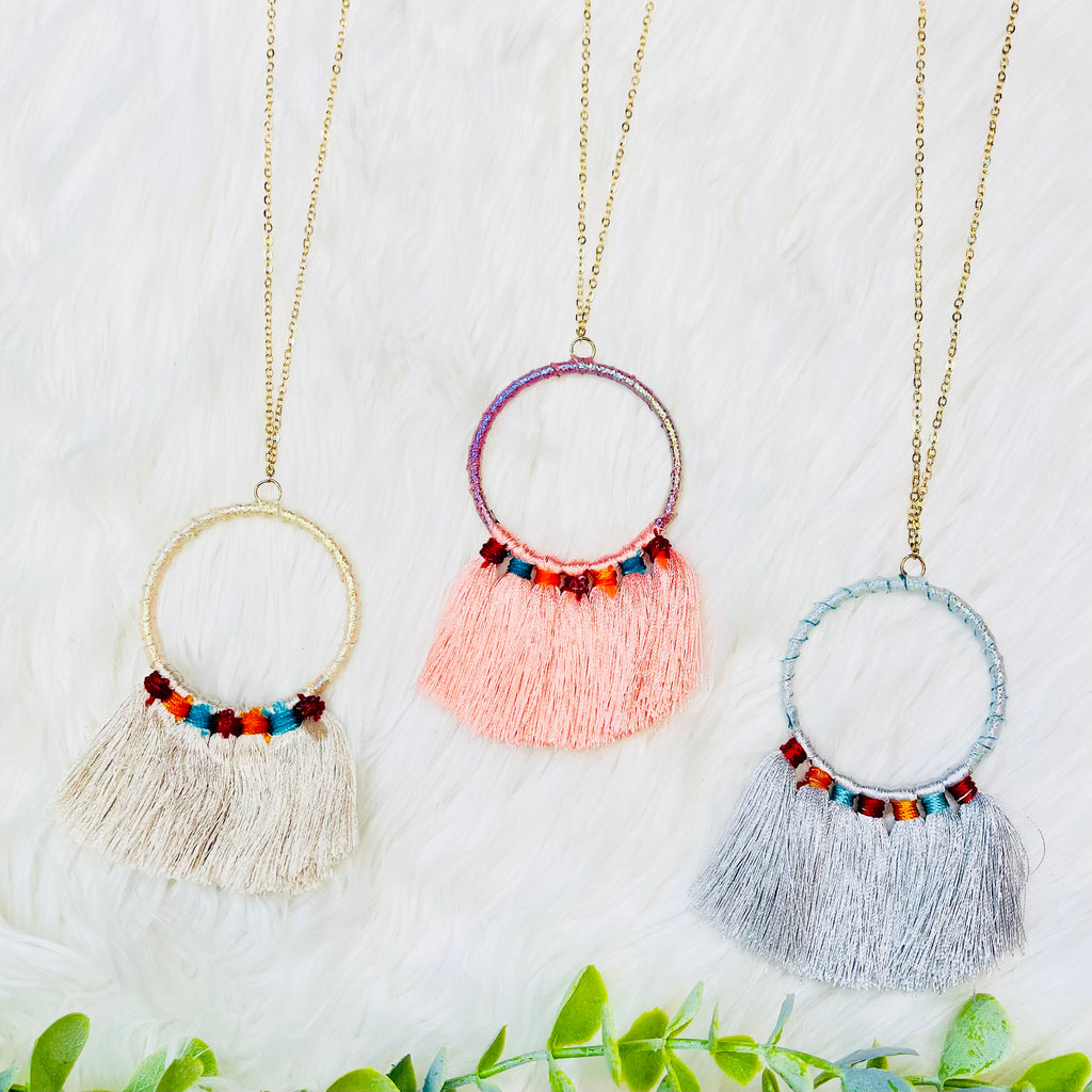 Fabric Wrapped Round Tassel Necklace