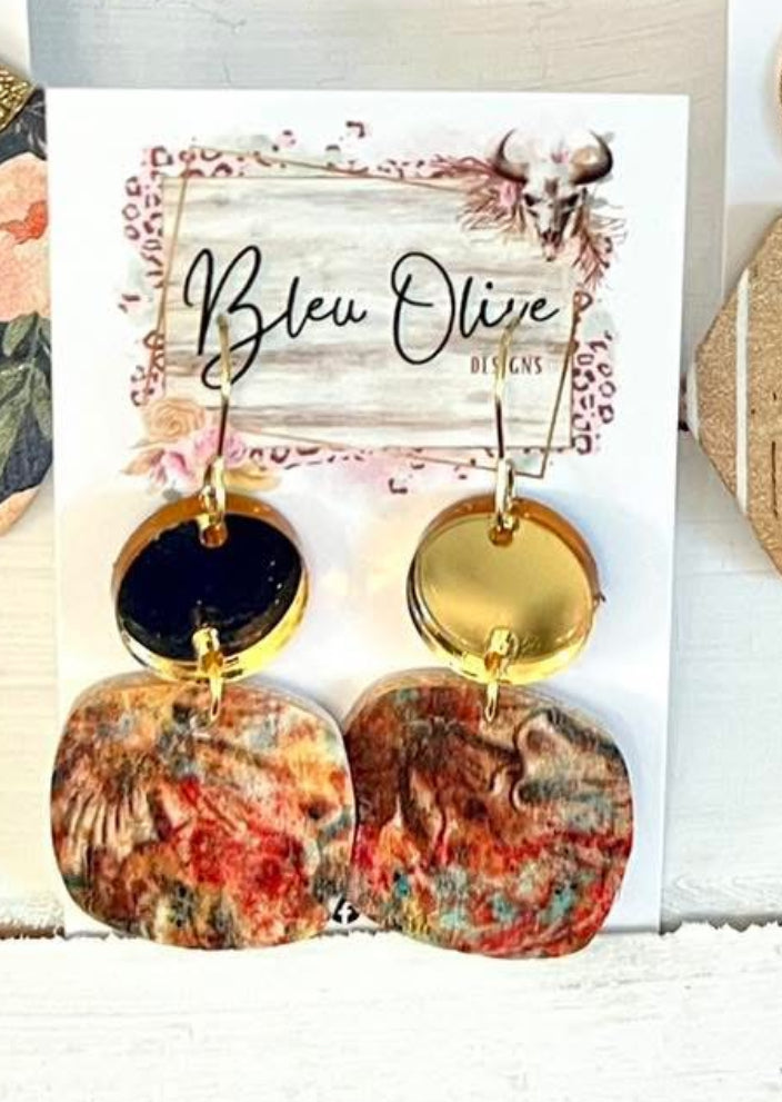 ABSTRACT WATERCOLOR MULTI COLORED FALL-WARM TONE ROUNDED SQUARE WITH GOLD MIRROR CHARM HANDMADE EARRINGS BY B.O.D
