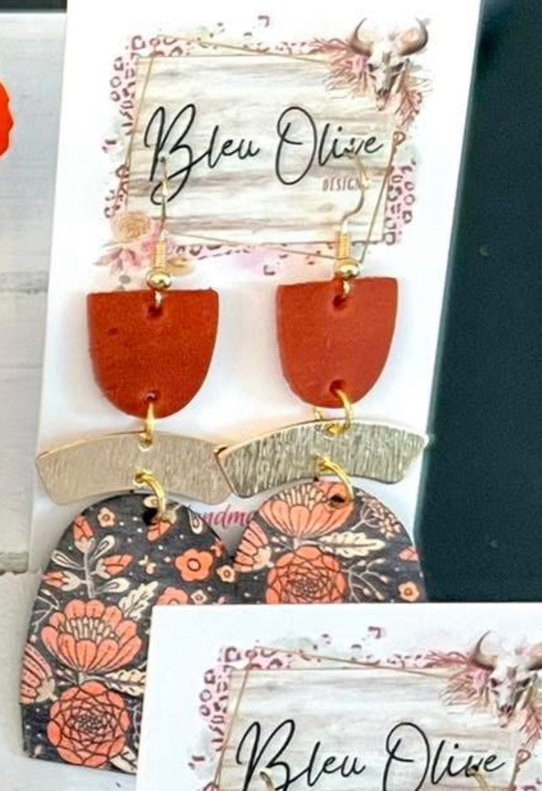 RUST FLORAL ON NAVY CREAM 3 TIER DANGLY GOLD EMBELLISHMENT AND RUST TOPPER HANDMADE EARRINGS BY B.O.D