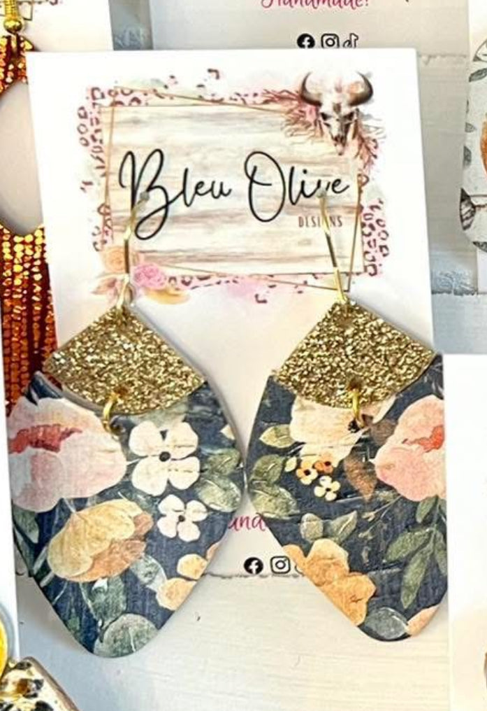NAVY MUSTARD SAGE ROSE COLORED FLORAL WTERCOLOR PRINT WITH GOLD GLITTER TOPPER HANDMADE EARRINGS BY B.O.D