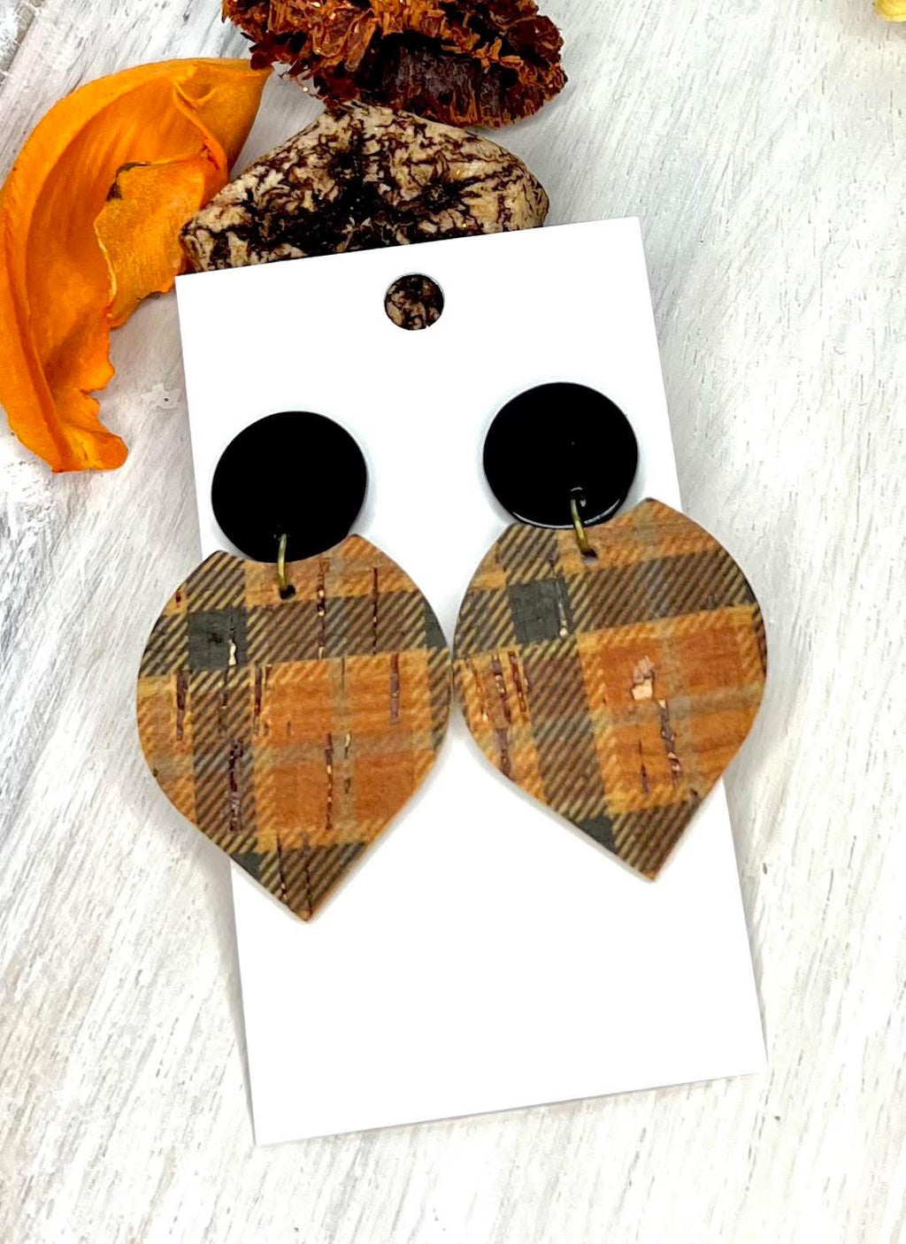 RUST PLAID FALL WARM TONED LEATHER TEARDROP HANDMADE EARRINGS BY B.O.D