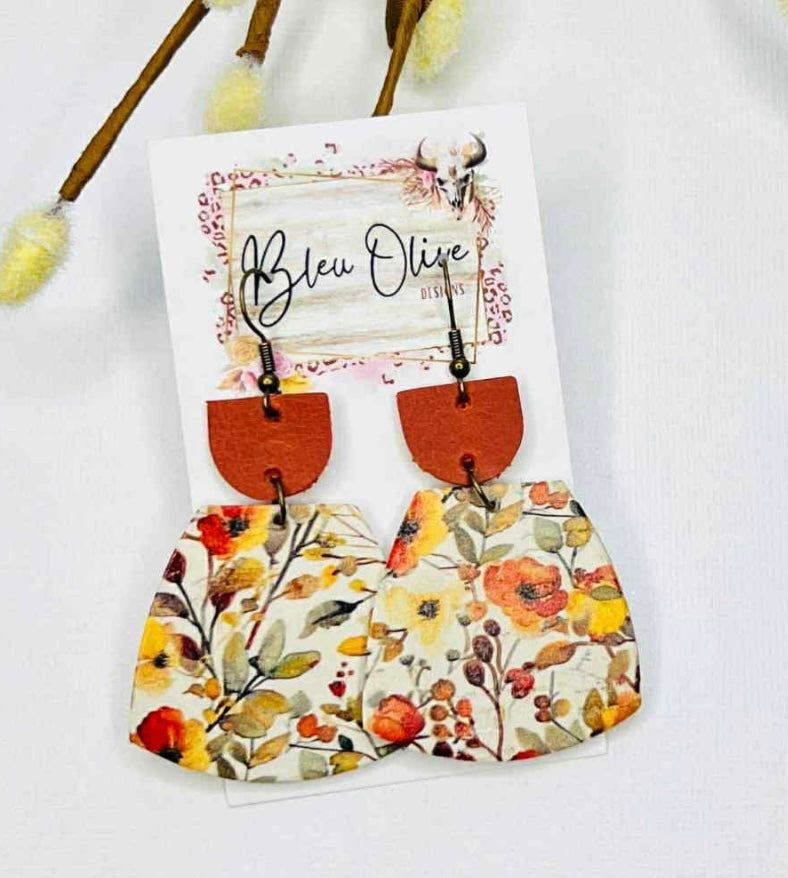 RUST WARM TONED COLORED FLORAL PRINT GEO SHAPE TWO TIER "HARVEST GATHERING" LEOPARD PUMPKIN LEATHER HANDMADE EARRINGS BY B.O.D