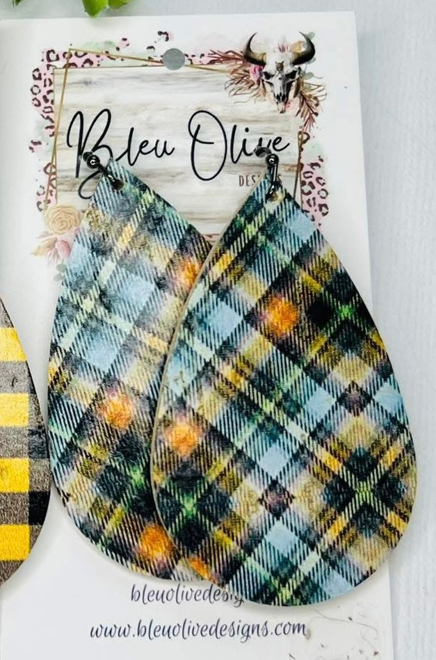BLUE & ORANGE & GREEN PLAID TEARDROP DANGLE LEATHER HANDMADE EARRINGS BY B.O.D