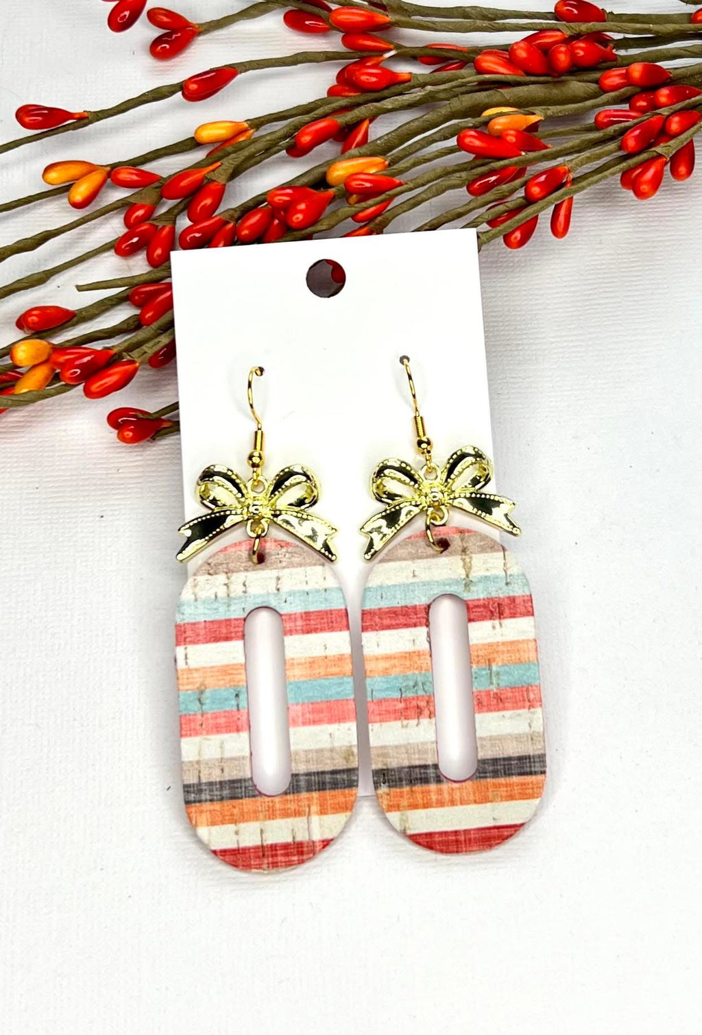 COLORFUL MULTI-COLORED HORIZONTAL STRIPED OVAL OPEN-CENTER LEATHER WITH GOLD METAL BOWS / RIBBONS HANDMADE EARRINGS BY B.O.D