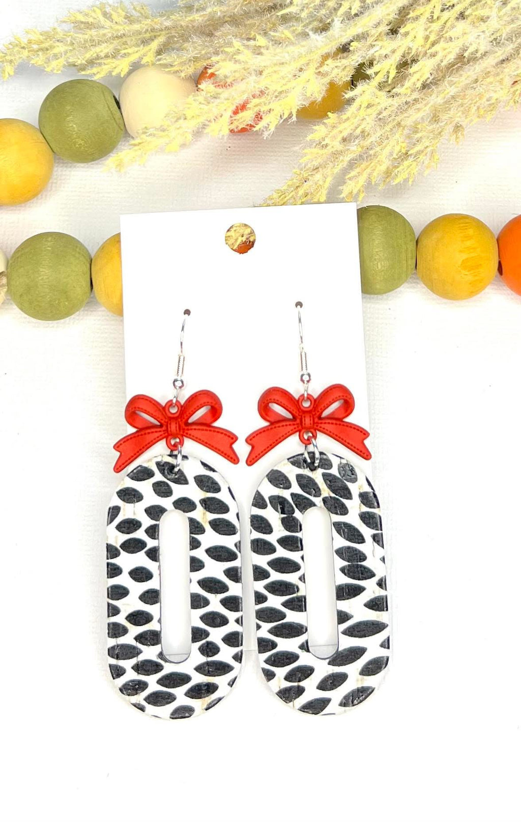 BLACK & WHITE DOTTED OVALS WITH OPEN-CENTER AND RED METAL BOWS / RIBBONS LEATHER HANDMADE EARRINGS BY B.O.D