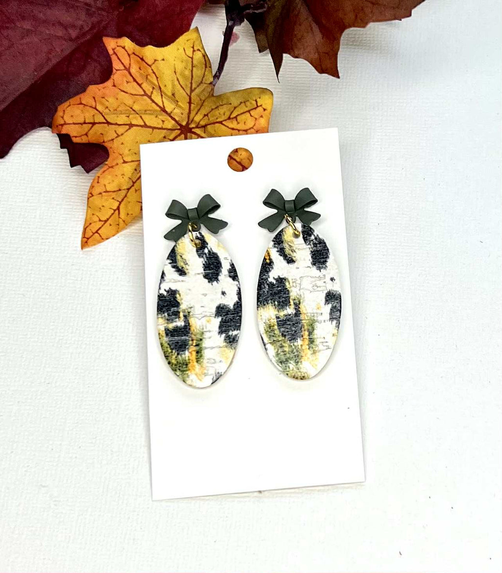 BLACK & WHITE & YELLOW & GREEN ANIMAL PRINT OVALS WITH OLIVE METAL RIBBONS / BOWS HANDMADE EARRINGS BY B.O.D