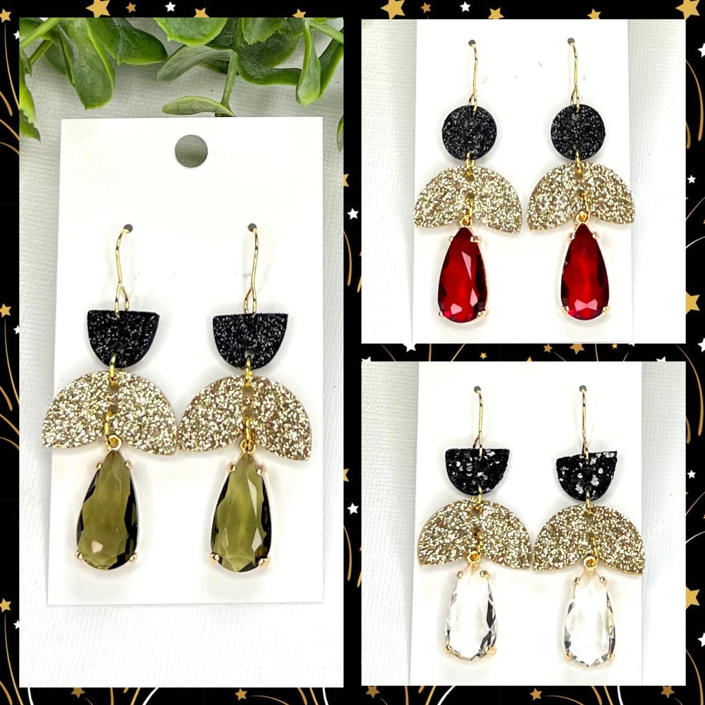 GLITZ & GLAM GLITTER GEO SHAPE LEATHER WITH GEMSTONES HANDMADE EARRINGS BY B.O.D
