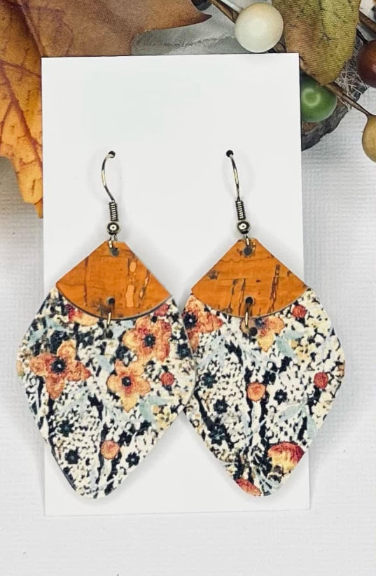 RUST ORANGE & DARK FLORAL PRINT DIAMOND SHAPE LEATHER HANDMADE EARRINGS BY B.O.D