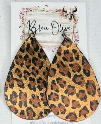 METALLIC LEOPARD PRINT BROWN TEARDROP LEATHER HANDMADE EARRINGS BY B.O.D