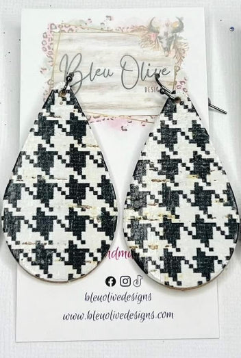 BLACK & WHITE HOUNDSTOOTH TEARDROP LEATHER HANDMADE EARRINGS BY B.O.D