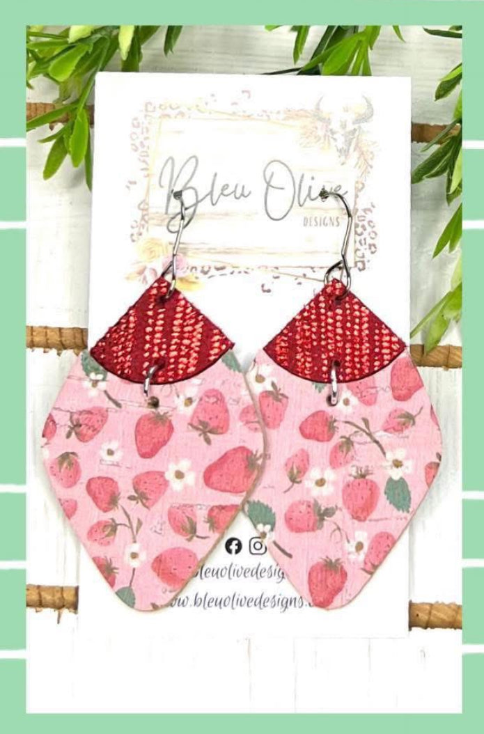 DIAMOND SHAPE RED METALLIC STRAWBERRY PRINT HANDMADE EARRINGS BY B.O.D