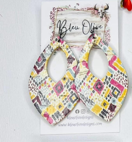 AZTEC MAGENTA MUSTARD CREAM PRINTED LEATHER TEARDROP HANDMADE EARRINGS BY B.O.D