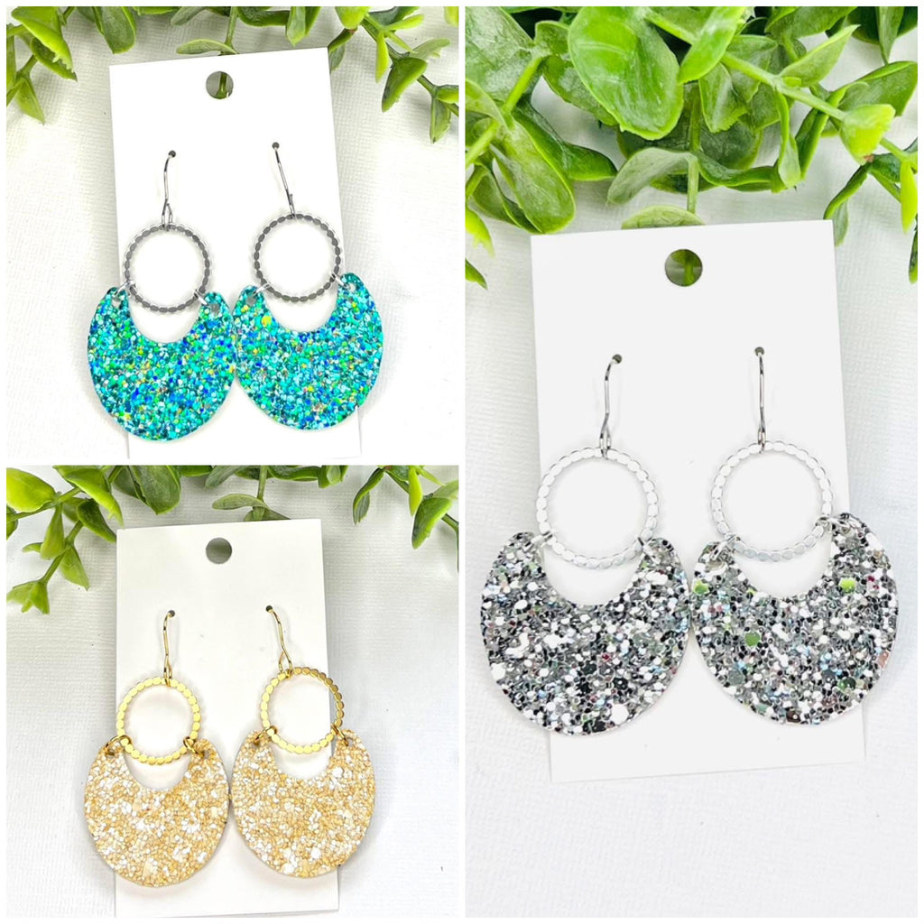GLITTER LEATHER WITH ROUND SCALLOPED DISC HANDMADE EARRINGS BY B.O.D