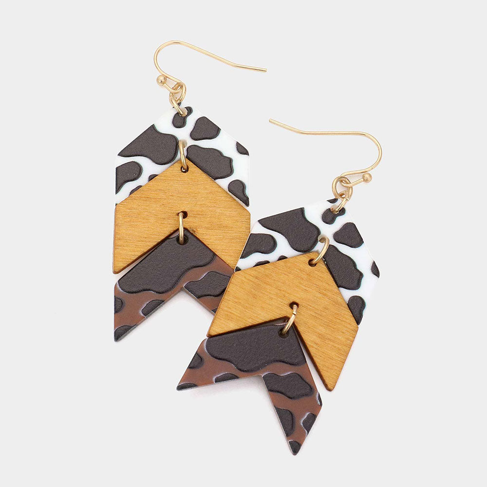 Cow Print Mustard Wood Arrow Earrings
