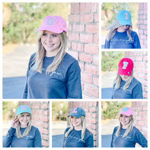 These hats 🧢 are so stinkin’ cute! These trendy letter patches are ALL THE RAGE right now! 🧢 Obsessed with all the bright colors offered in these hats! Perfect for spring & summer. Snag you a spring break hat 🧢 now before they’re gone!Â